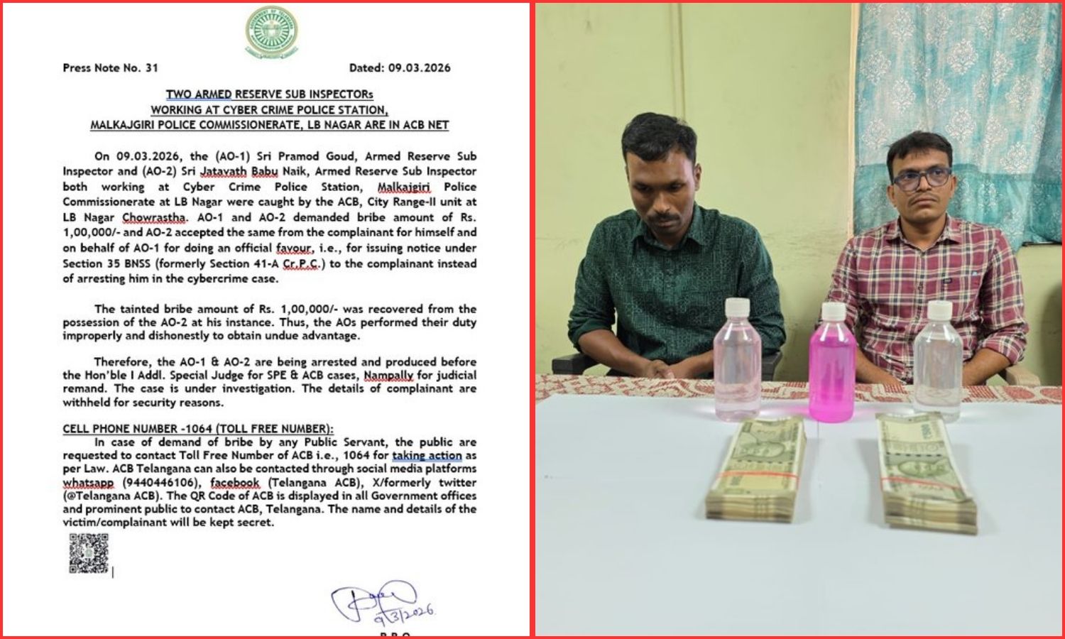 Hyderabad: The Telangana Anti-Corruption Bureau (ACB) arrested two Armed Reserve Sub Inspectors working at the Cyber Crime Police Station under the Rachakonda Police Commissionerate in LB Nagar.