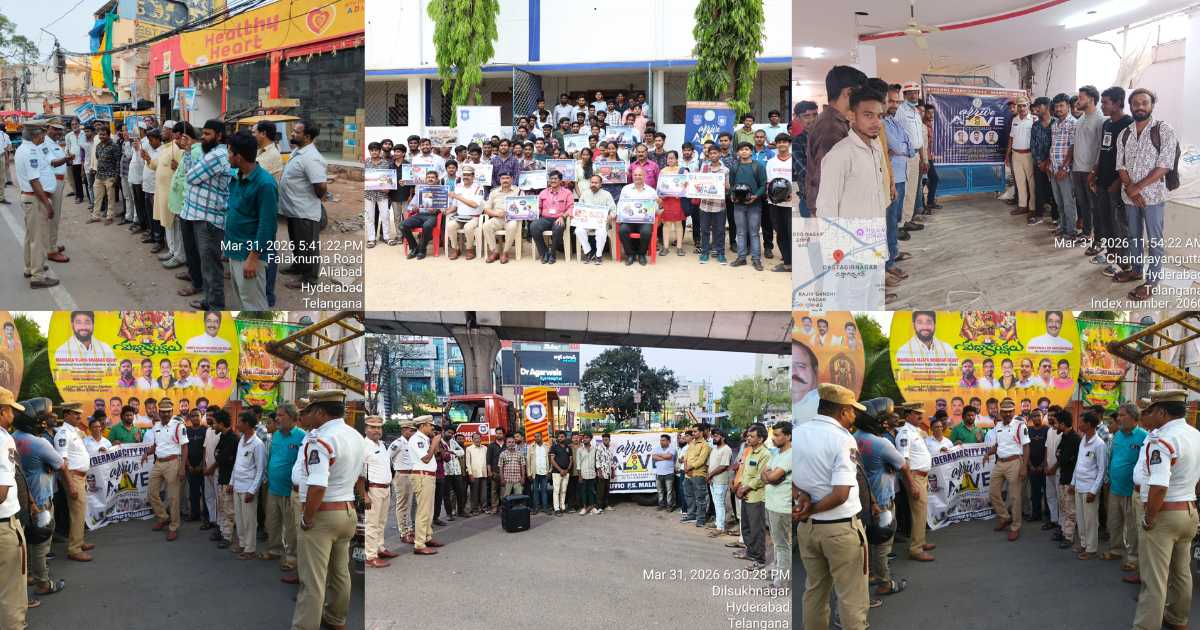 Hyderabad: Traffic police conducted the Arrive Alive campaign across multiple locations in the city on March 31, 2026, to raise awareness about road safety and responsible driving practices.