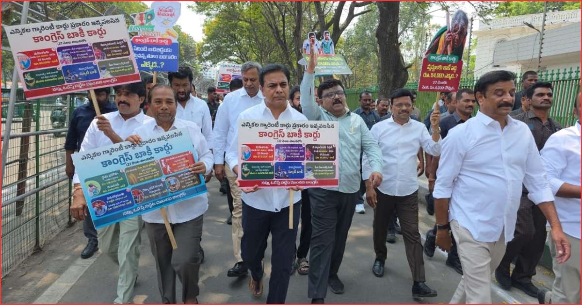 The protest underlined growing political friction between the opposition BRS and the ruling Congress during the budget session. It also highlighted disputes over implementation of major welfare and employment assurances.