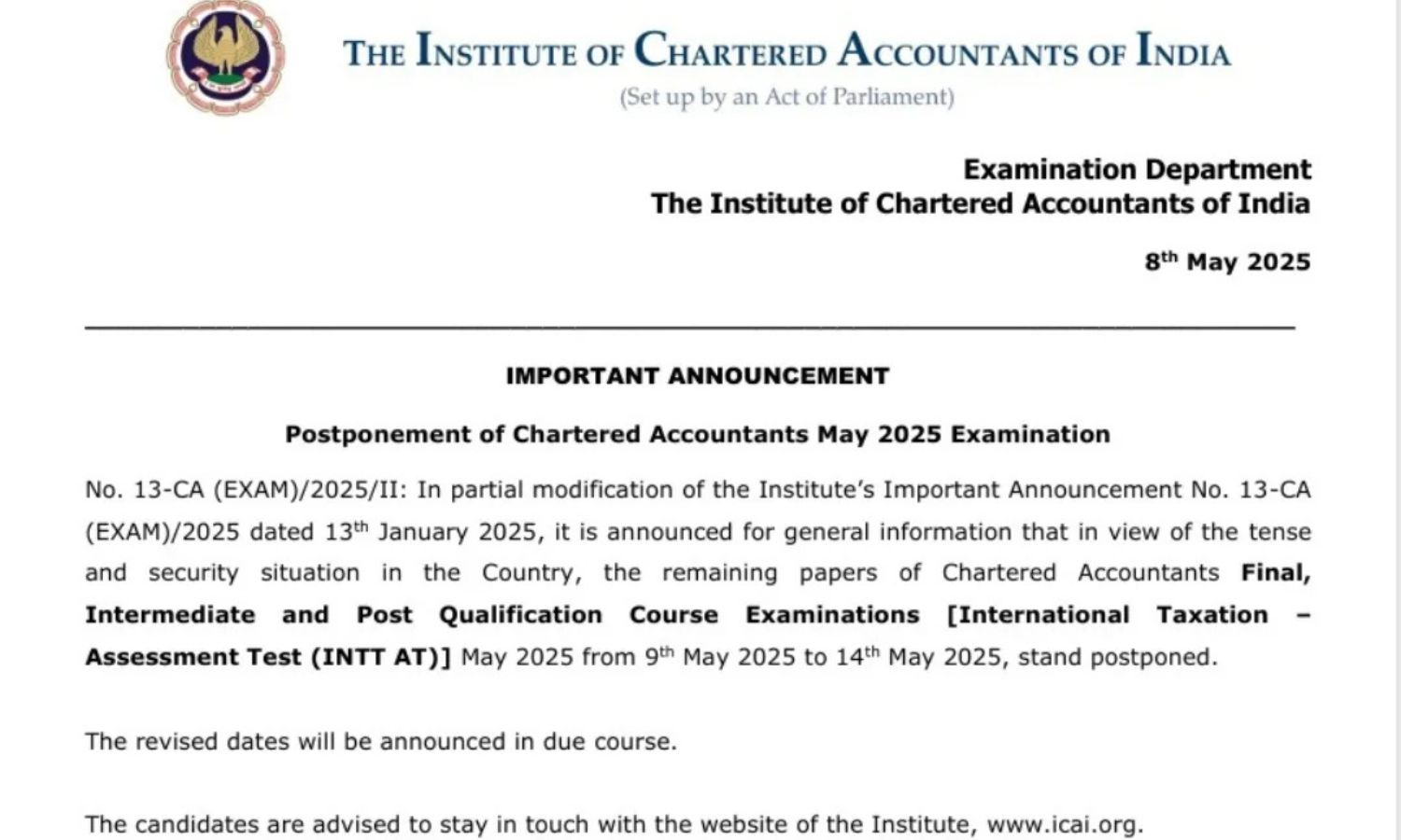 Hyderabad: The Institute of Chartered Accountants of India (ICAI) postponed the CA exams for May 2025 across the country amid rising tensions between India and Pakistan.