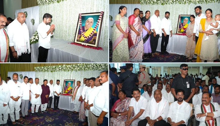 Revanth Reddy attended the 12th-day ceremony of Lakshmi Narasamma, mother of MLA Bhupati Reddy, in Nizamabad. He paid floral tributes to her portrait and consoled the MLA and his family members during the ceremony.