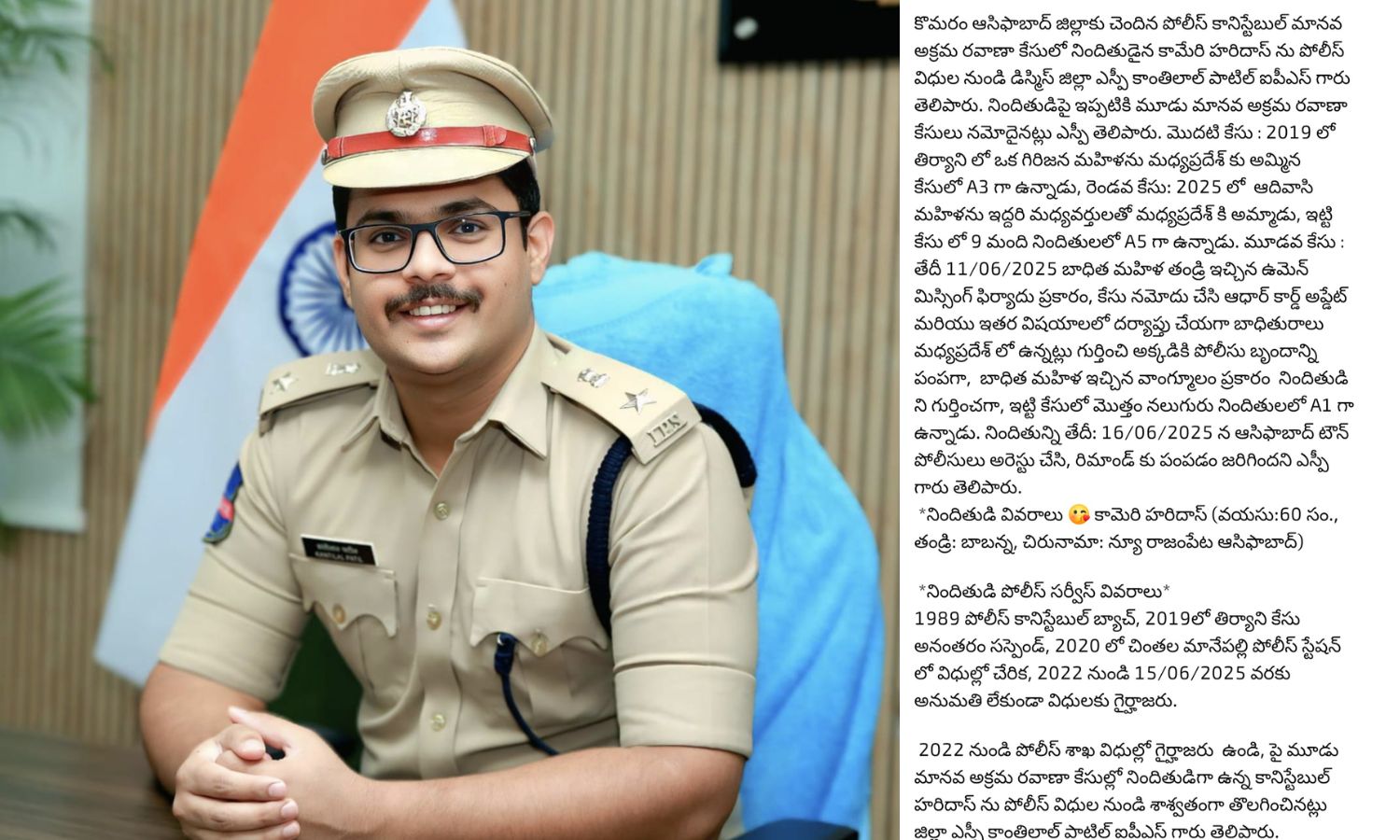 మానవ అక్రమ రవాణా కేసులో నిందితుడైన కానిస్టేబుల్ హరిదాస్ ను పోలీస్ విధుల నుండి డిస్మిస్ — జిల్లా ఎస్పీ కాంతిలాల్ పాటిల్ ఐపిఎస్