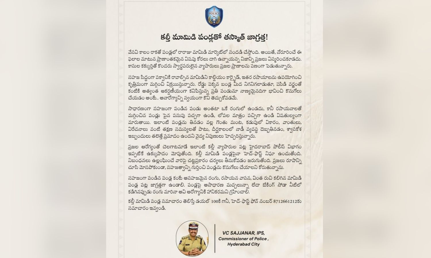 Hyderabad: City Police Commissioner V C Sajjanar warned the public against adulterated mangoes in Hyderabad and urged citizens to remain cautious during the summer season.
