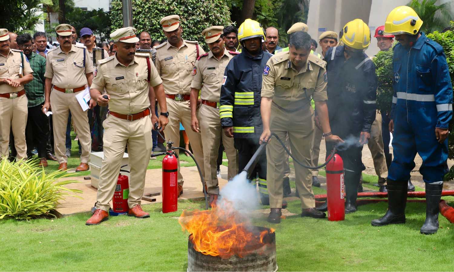 The drill began with a fire alarm, triggering an immediate evacuation of all personnel from the Cyberabad Police Commissioner’s Office. Staff followed designated routes to the Assembly Point near the National Flag Post, guided by trained Fire Marshals.