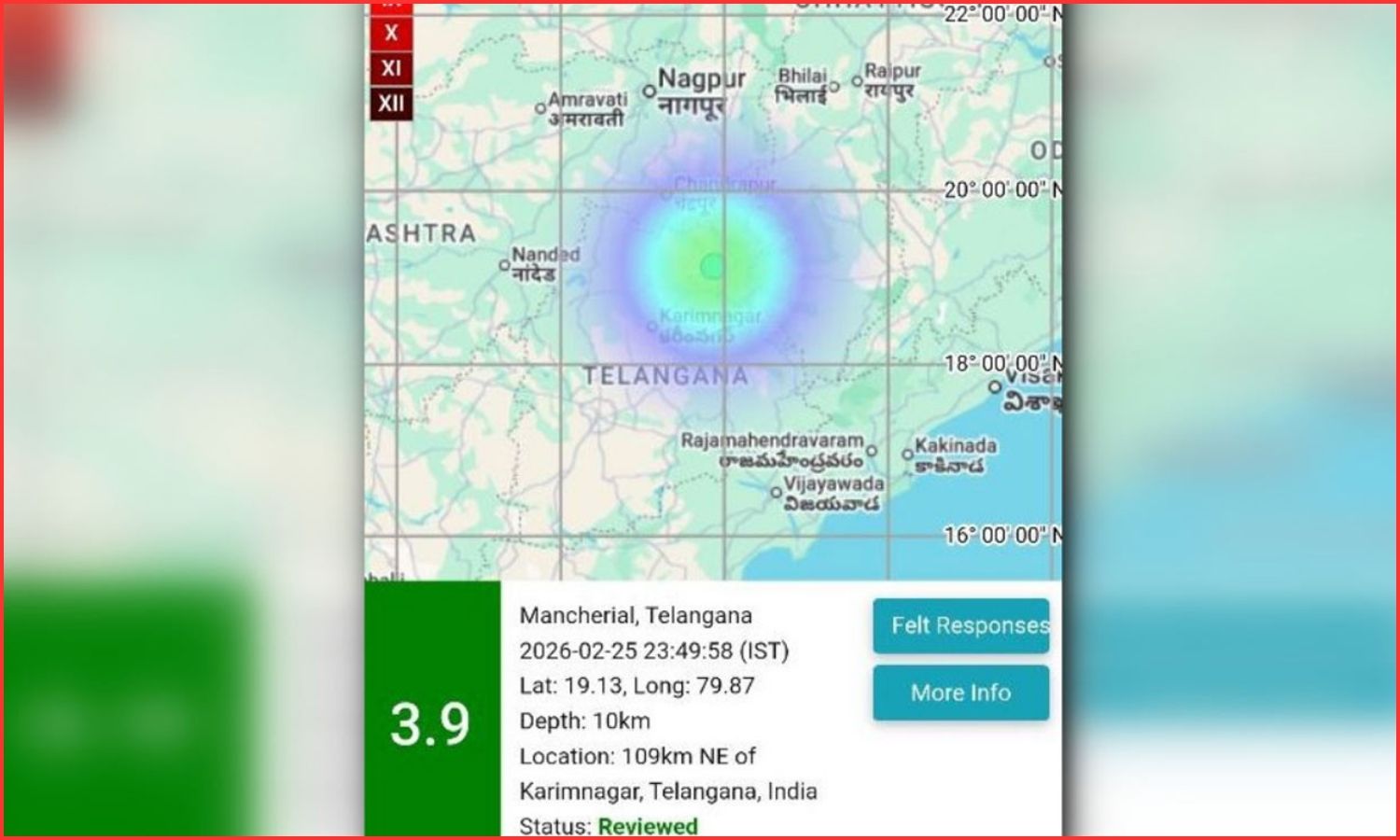 Seismology officials placed the epicentre about 35 kilometres from Mancherial. Tremors extended up to the Telangana–Maharashtra border.