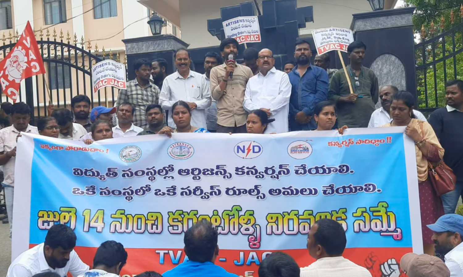 Hyderabad: Electricity artisans in Telangana will launch an indefinite strike from July 14, demanding conversion to permanent employee status. Protesters gathered outside the Electricity Bhavan in Nakkalagutta, Hanamkonda, on Wednesday under the banner of the TVAC JAC, braving the rain and raising slogans against the current system.
