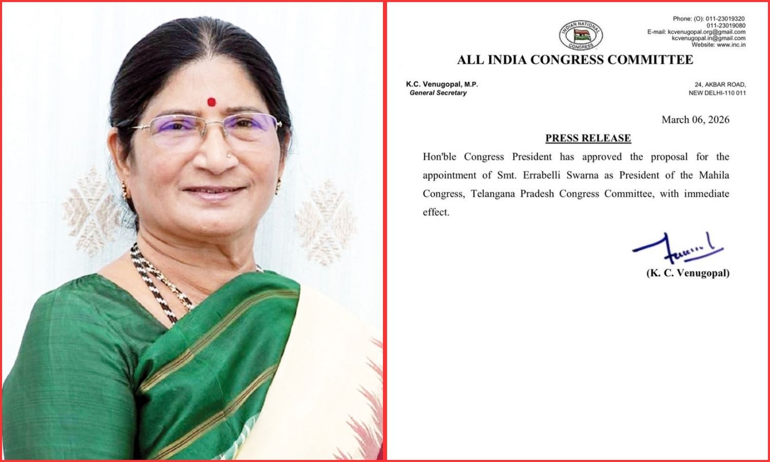 Hyderabad: The Congress high command appointed senior leader Errabelli Swarna as the new Mahila Congress president for Telangana.