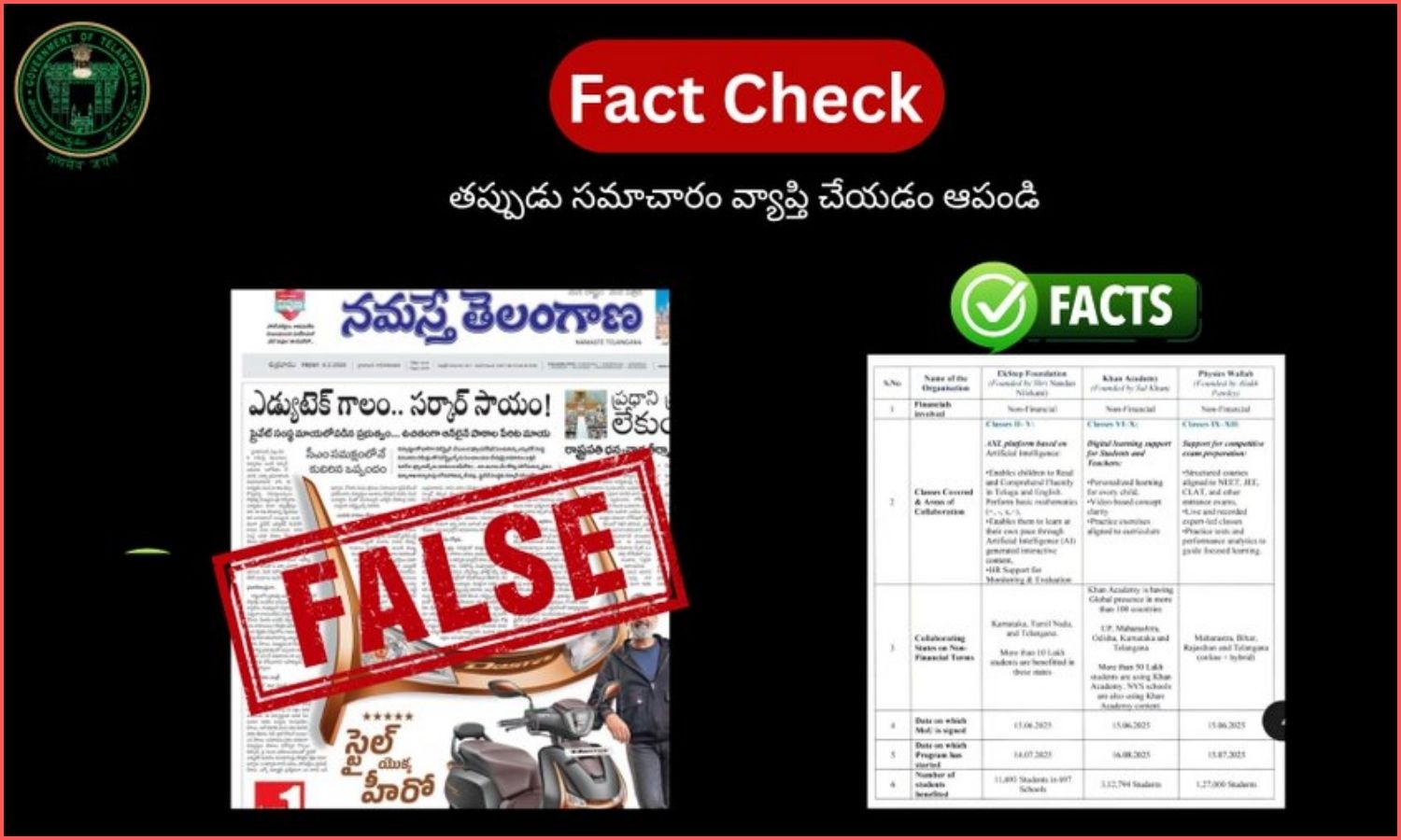 Hyderabad: The Telangana government issued an official clarification through the Fact Check Telangana X handle, rejecting a news report published in Namaste Telangana on February 6, 2026, on initiatives of the School Education Department and terming it misleading.