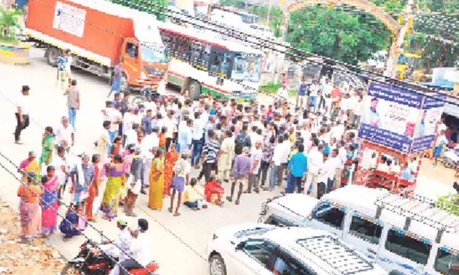 The protest caused a half-hour traffic jam near the bus stand and Housing Board area. Police arrived to pacify the crowd, but farmers confronted Circle Inspector Ashok Reddy, questioning the administration’s inaction.