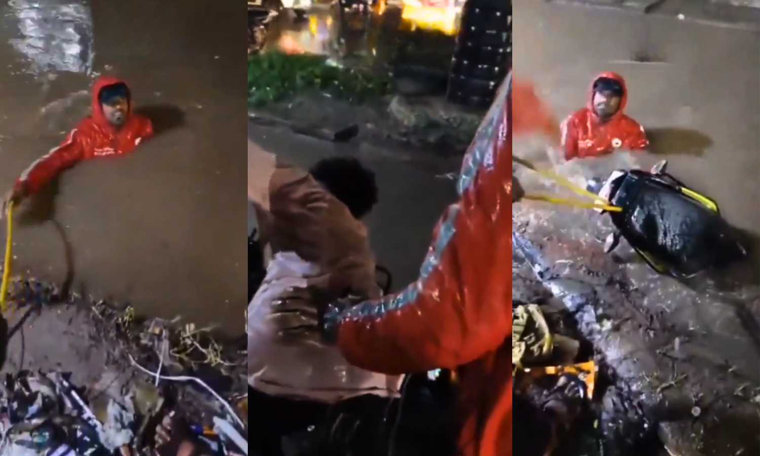 Hyderabad: A food delivery worker was rescued after falling into an open drain during Saturday night’s heavy rain in Hyderabad. The incident occurred near TKR Kaman in LB Nagar and was caught on video, which later went viral on social media.