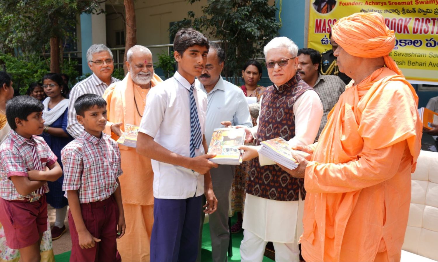 The initiative saw the distribution of 4,000 long notebooks and 1,600 short notebooks to students. The Governor was joined by Principal Secretary to the Governor M. Dana Kishore, Swami Munishwaranandaji Maharaj, Secretary of the Hyderabad Ashram, and Swami Venkateswaranandaji Maharaj.