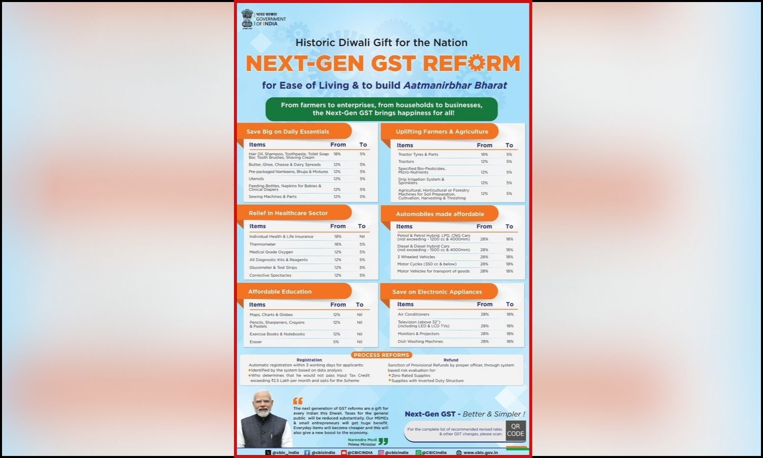 Prime Minister Narendra Modi hailed the overhaul, calling it a “pro-people reform that will benefit households, farmers, MSMEs, women, and youth,” while boosting demand and simplifying compliance for businesses.