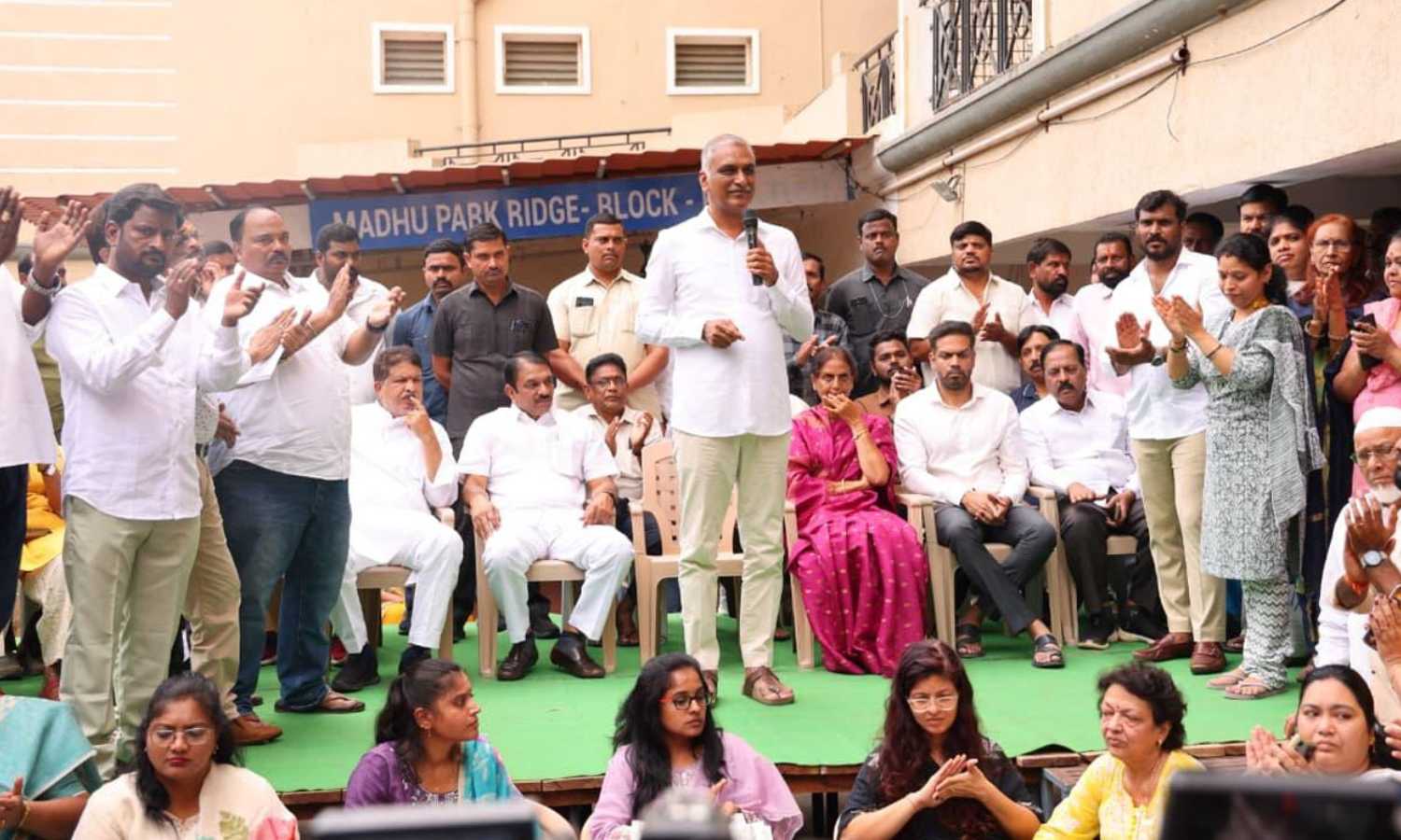 Harish Rao, along with BRS MLAs Sabitha Indra Reddy, Sudheer Reddy and Madhavaram Krishna Rao, as well as Rajendranagar BRS in-charge Karthik Reddy, met families of Madhu Park Apartments who are facing eviction notices. He said authorities were forcing middle-class residents to vacate their homes in the name of the Musi Riverfront Project.