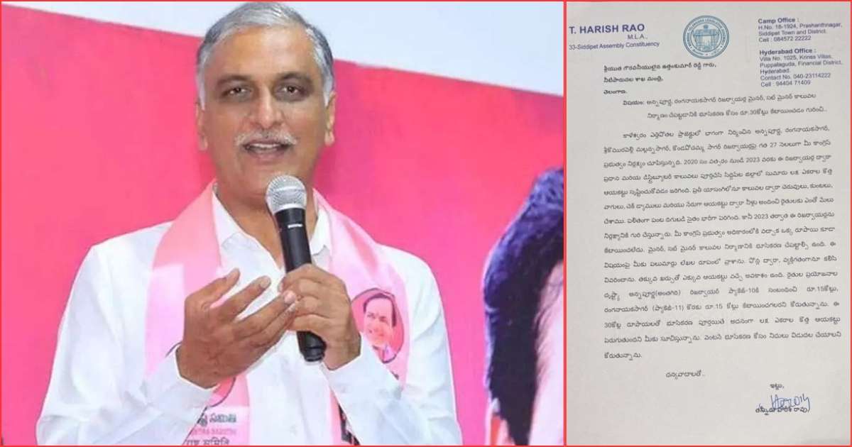Harish Rao wrote to state Irrigation Minister Uttam Kumar Reddy seeking funds for land acquisition for canal construction under the Kaleshwaram Lift Irrigation Project.