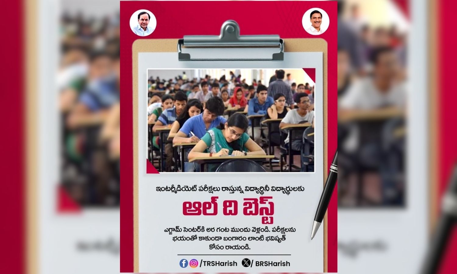 In a message posted on X, Harish Rao conveyed his heartfelt wishes to all candidates taking the Intermediate examinations. Students should write their papers with courage and self-confidence without yielding to pressure, he said.