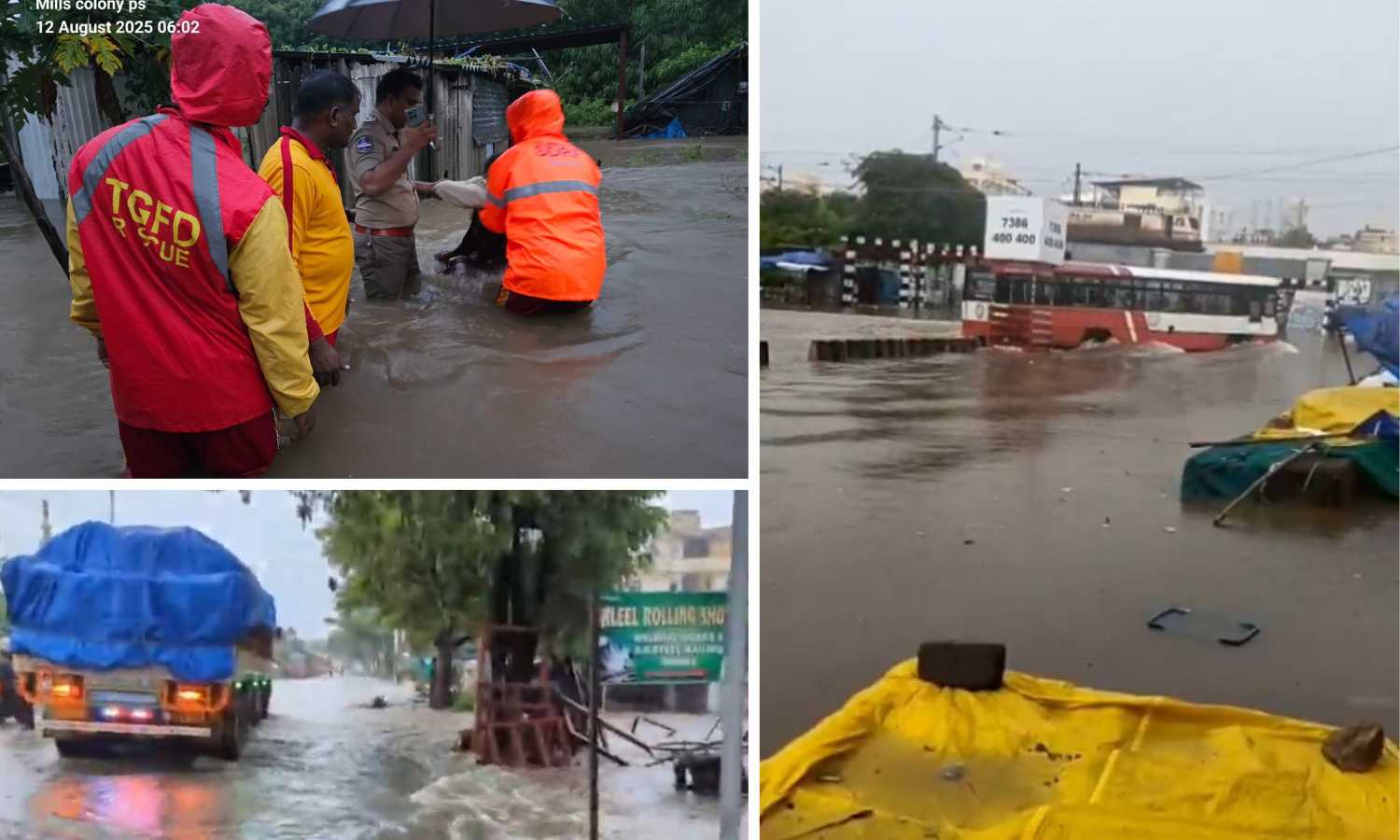 Hyderabad: Heavy rains battered Warangal, Hanumakonda, and Kazipet from midnight on Monday, flooding low-lying areas and disrupting traffic. In Hanumakonda, waterlogging hit the bus stand, Chowrasta, and residential localities such as Hasanparthy, Reddypuram, Gokul Nagar, Ambedkar Nagar, and New Shayampet. Officials urged residents in vulnerable spots to shift to safer places.