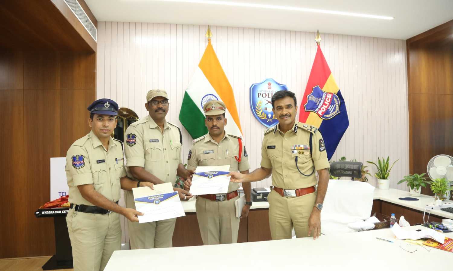 Hyderabad Police Commissioner C.V. Anand, IPS, presented cash rewards and certificates of appreciation to both constables in recognition of their prompt action. Saifabad Inspector Raghavendar was also present during the felicitation.