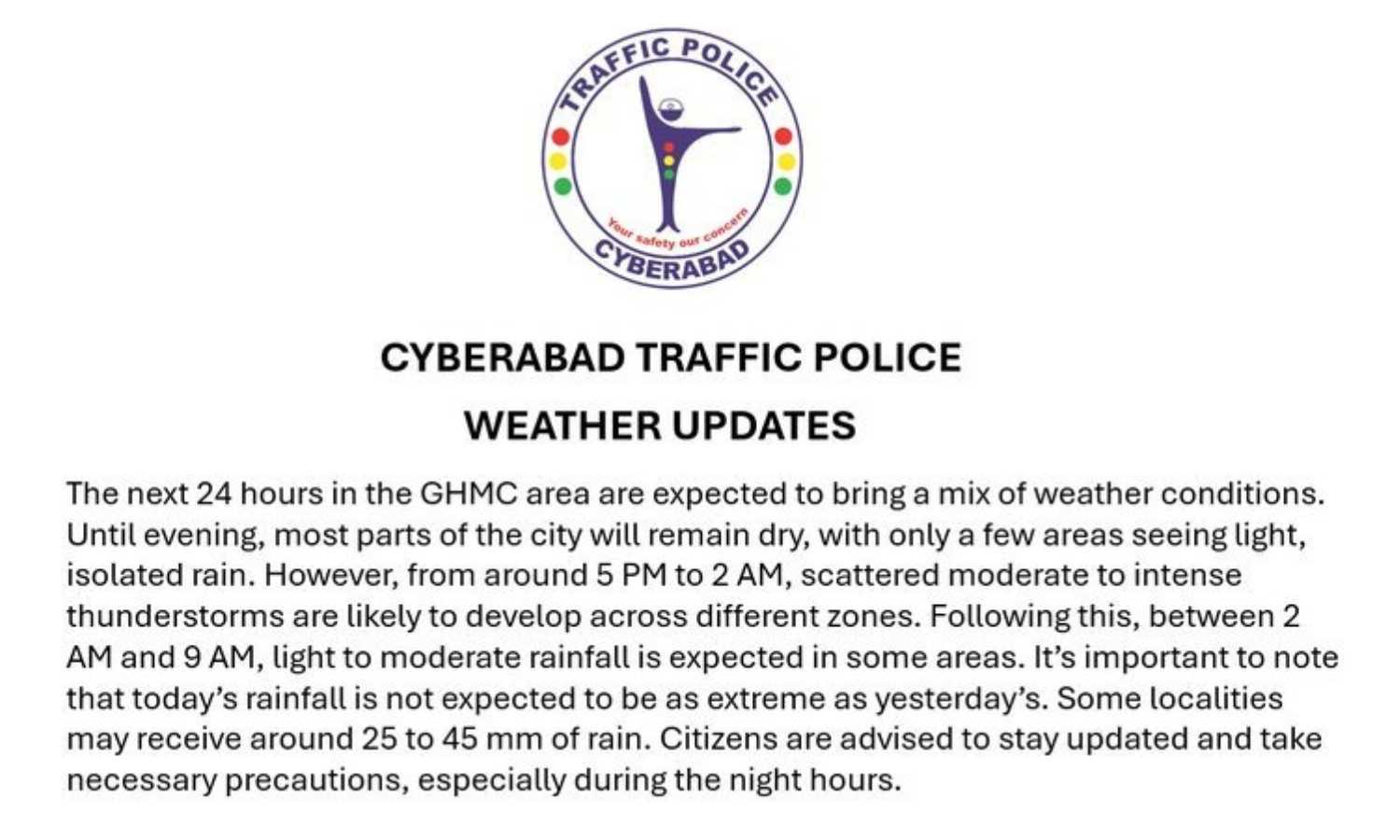 Hyderabad: The Greater Hyderabad Municipal Corporation (GHMC) area is expected to experience changing weather conditions over the next 24 hours, the Cyberabad Traffic Police said on Friday. Most parts of the city were forecast to remain dry until evening, with light and isolated showers in select localities.