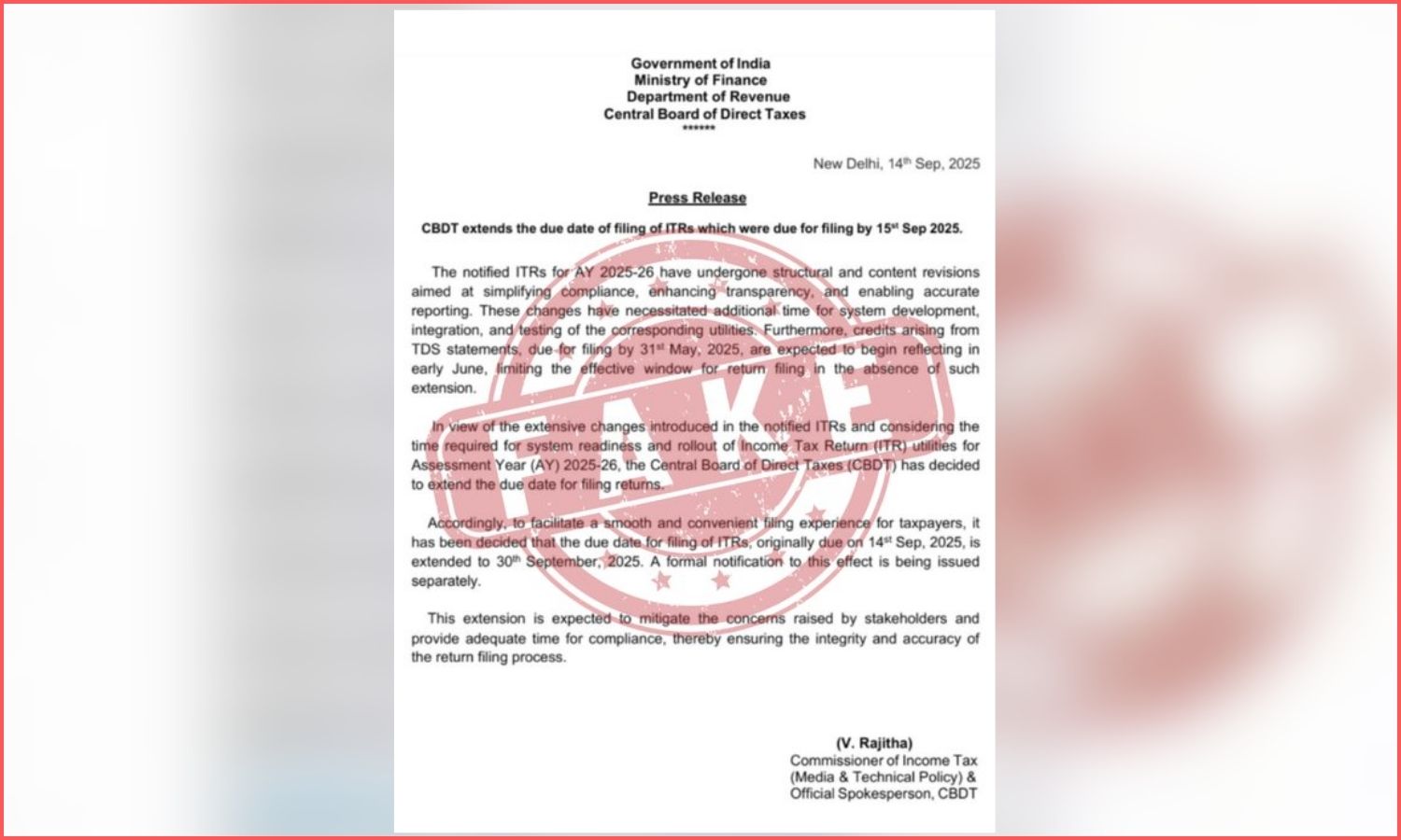 A fake news is in circulation stating that the due of filing ITRs (originally due on 31.07.2025, and extended to 15.09.2025) has been further extended to 30.09.2025.