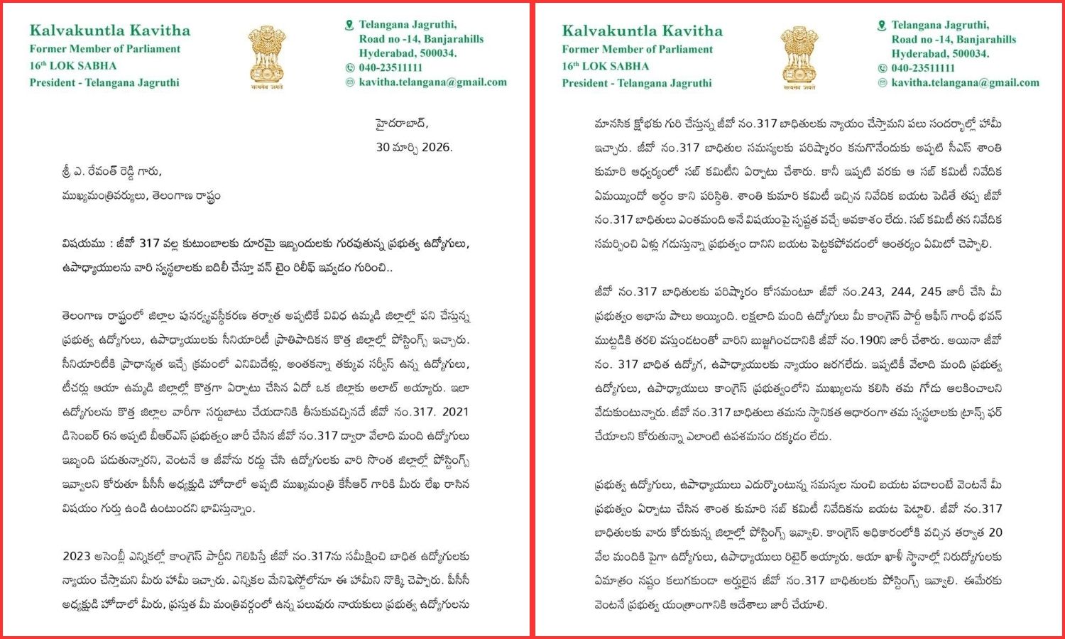 Hyderabad: Telangana Jagruti president K. Kavitha wrote to Chief Minister A. Revanth Reddy seeking relief for employees affected by GO 317.