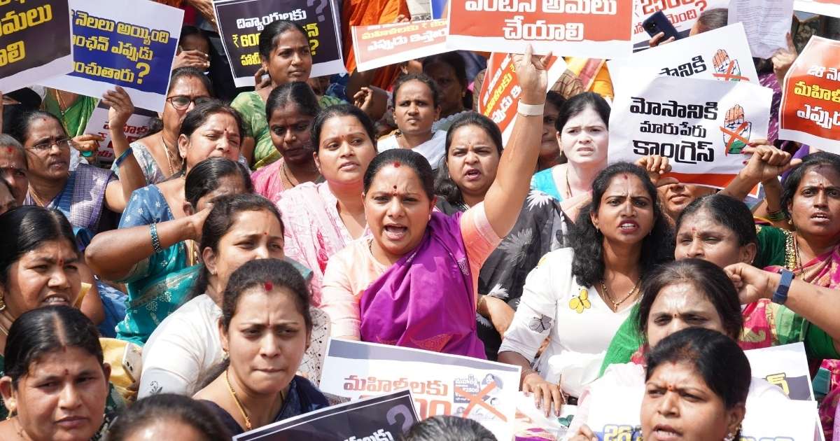 Women participants raised slogans during the stir at Praja Bhavan and questioned the delay in delivering key assurances. They cited promises of 10 grams of gold for brides, electric scooters for students and ₹2,500 monthly financial assistance for women.