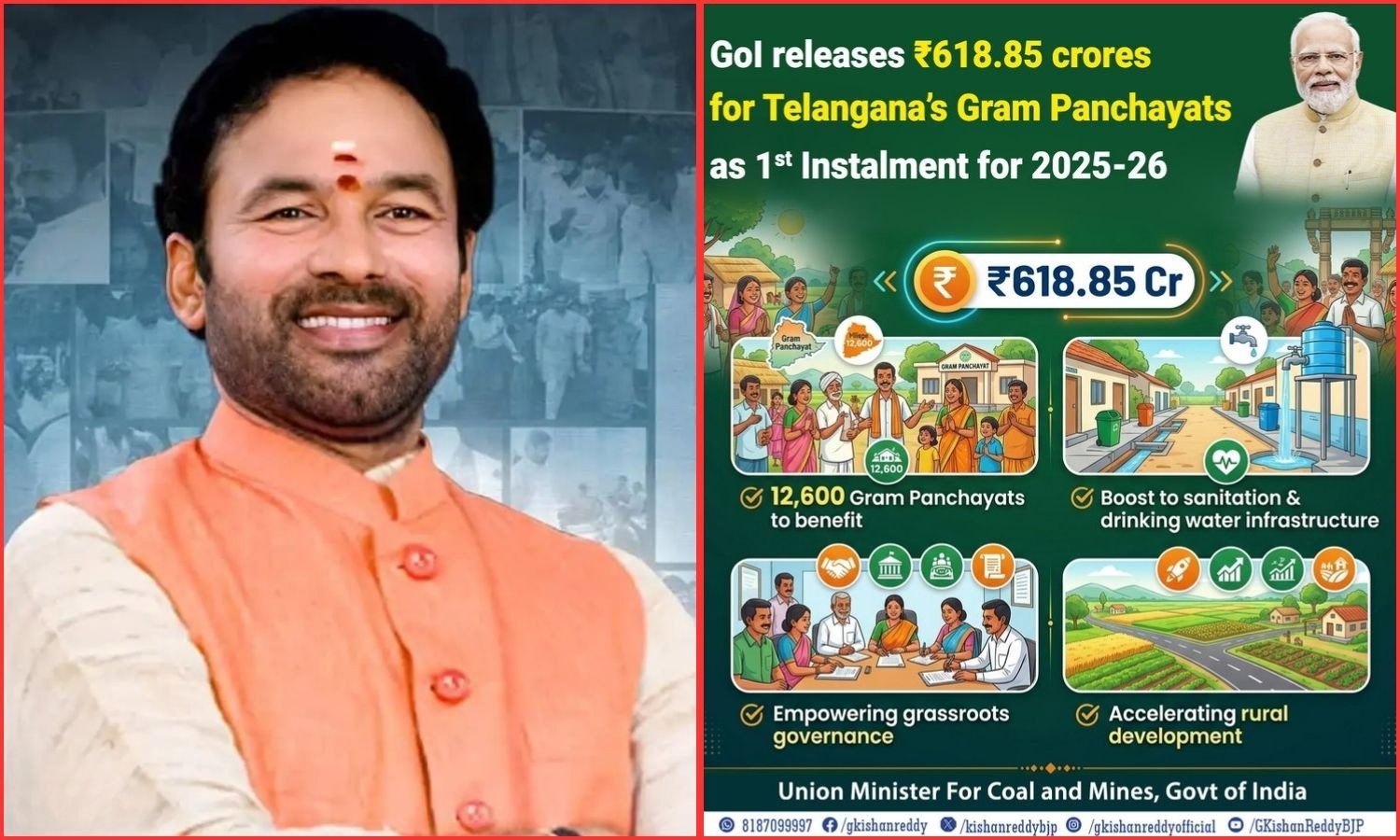 Gratitude to Hon’ble Prime Minister Shri @narendramodi ji and the Hon’ble Union Minister of Panchayati Raj Shri @LalanSingh_1 for releasing ₹619.85 crore to the Gram Panchayats of Telangana as the first instalment for 2025-26.