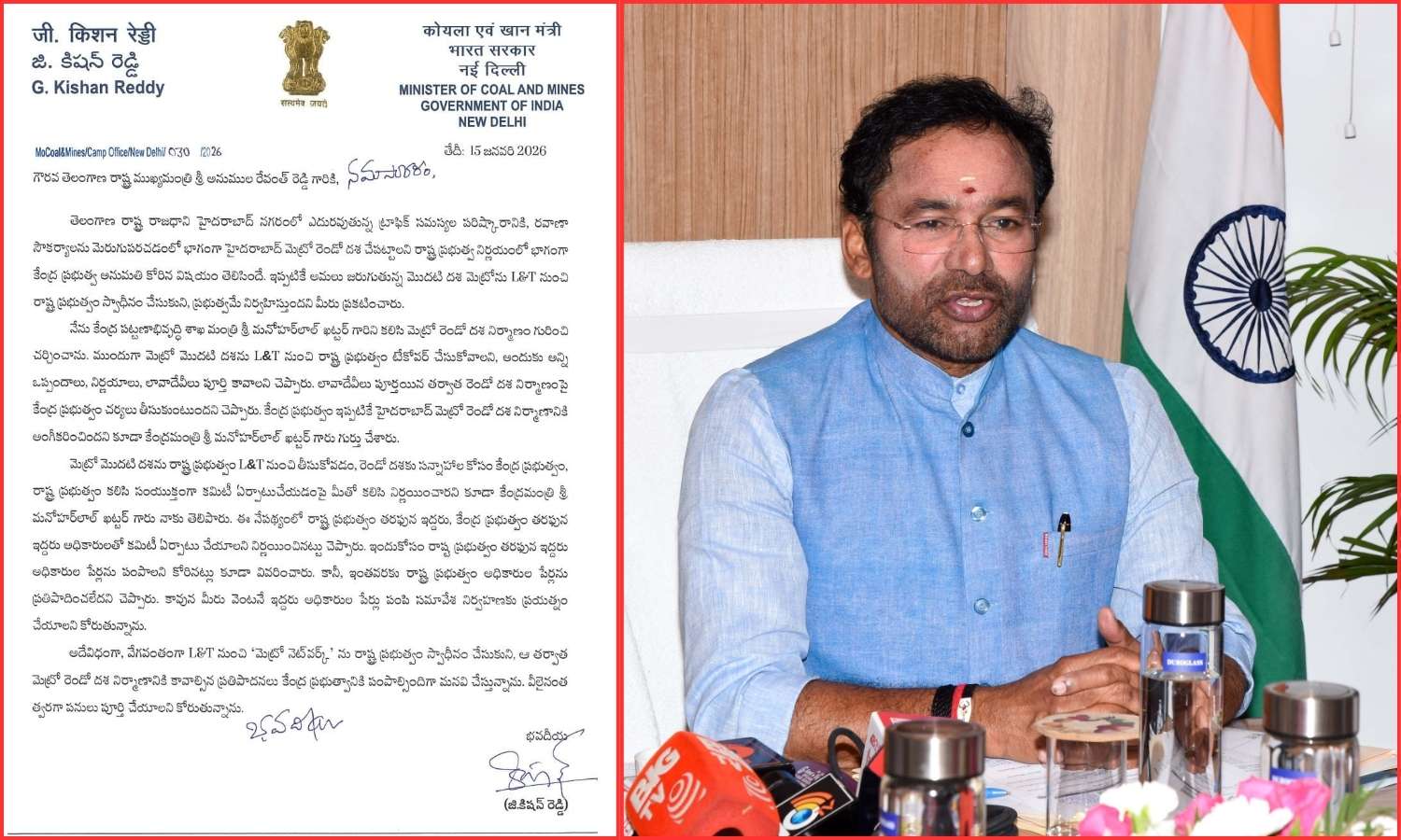 Hyderabad: Union Minister G. Kishan Reddy has written an open letter to Telangana Chief Minister A. Revanth Reddy. He urged swift completion of the state government’s proposed takeover of Hyderabad Metro Rail’s Phase I from L&T Metro Rail Hyderabad Ltd.