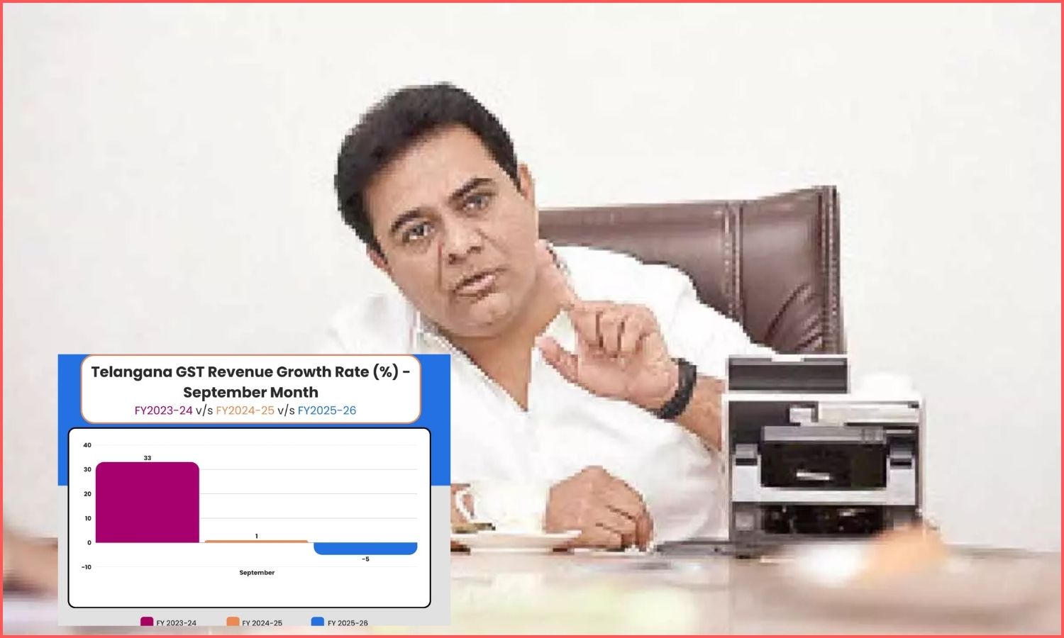 In a post on X, KTR said Telangana slipped to the bottom among states in GST growth for September 2025. Two years ago, under K. Chandrashekar Rao’s leadership, Telangana topped the nation in GST growth.