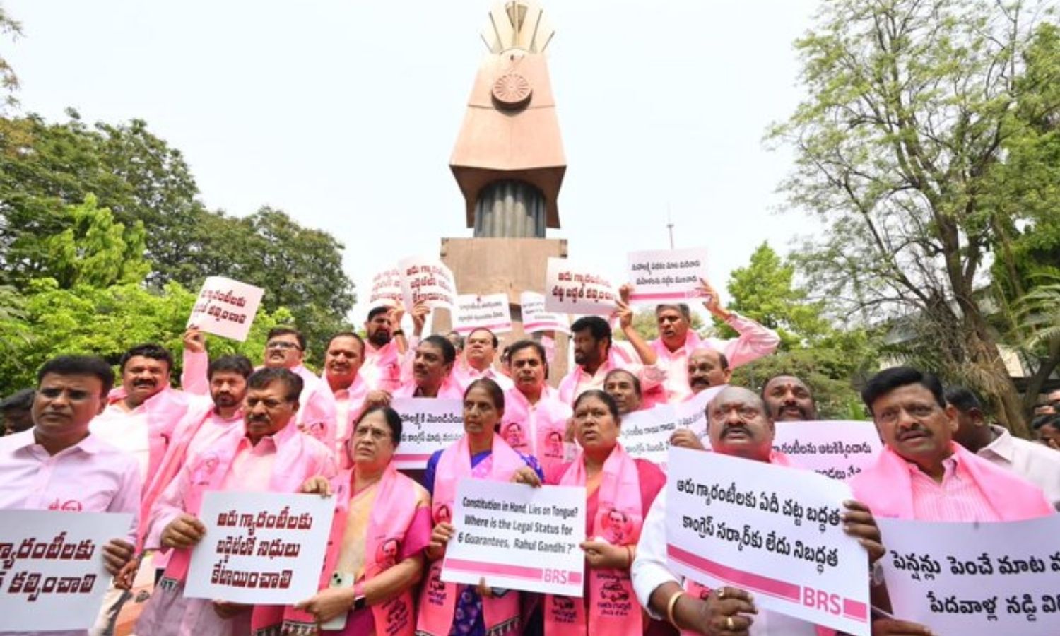 Placards carried messages demanding legal backing for the Six Guarantees. Protesters raised slogans such as “Provide statutory backing to the Six Guarantees” and “We want Rythu Bandhu, not Rahul Bandhu.” They also questioned delays in pensions, Rythu Bharosa and benefits under the Mahalakshmi scheme.
