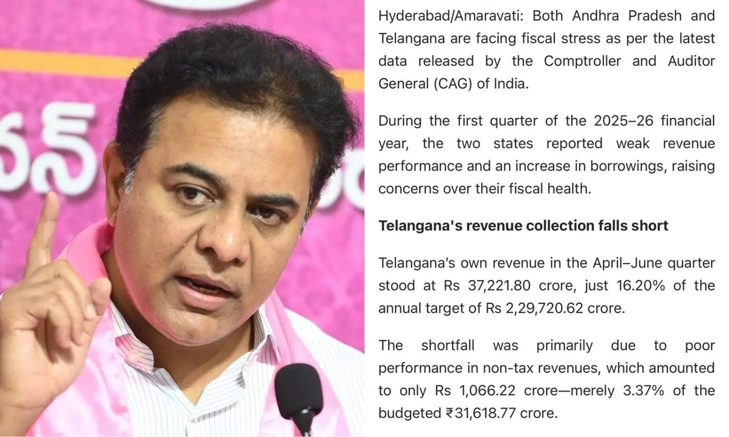 Quoting the CAG, KTR said the state’s financial condition had worsened within three months of the Congress assuming power. Telangana, which began with a surplus budget, was now facing a revenue deficit of ₹10,583 crore. Non-tax revenue collections were only 3.37% of budget estimates, he noted.