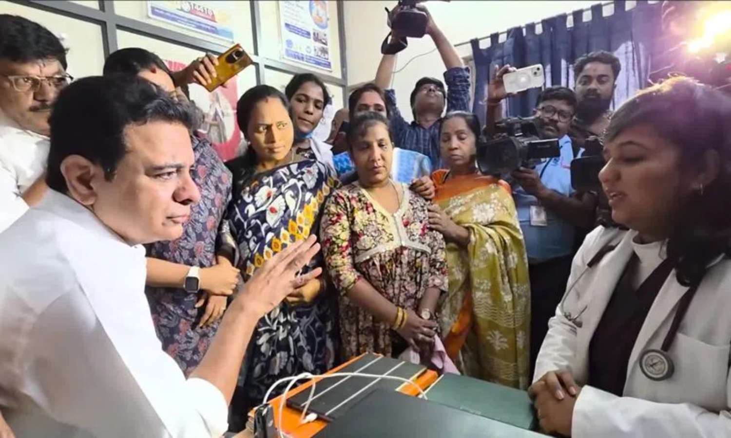 At the clinic, KTR interacted with doctors and reviewed medical supplies, equipment functioning, and service availability. A female doctor informed him that staff had not received salaries for four months. She also alleged the government was creating obstacles in the disbursement process.