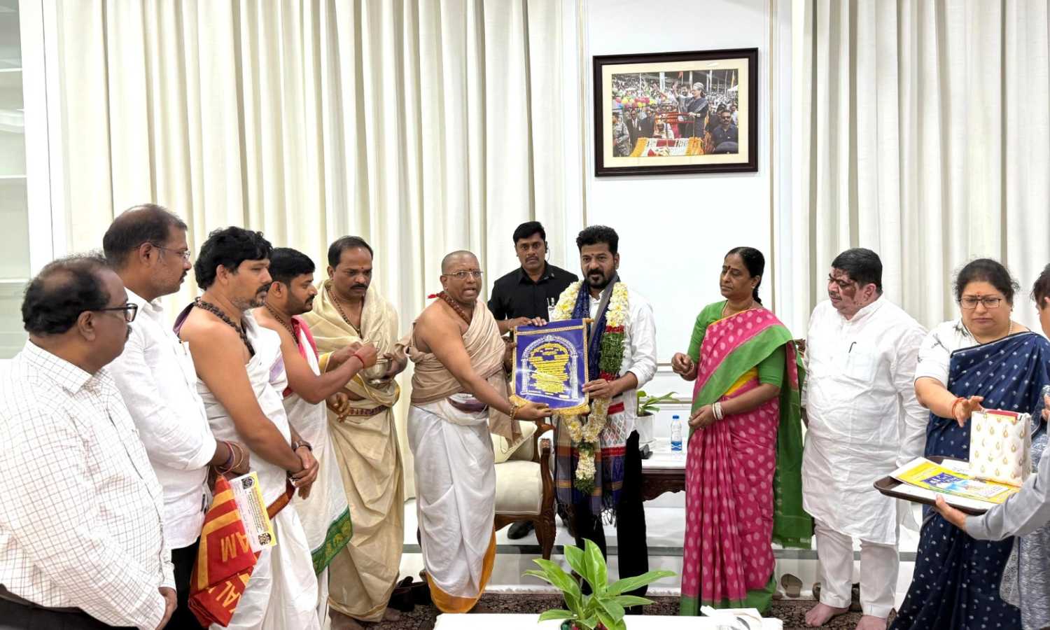 During the meeting, priests from the Mahankali temple offered traditional blessings to the Chief Minister on behalf of the temple community.