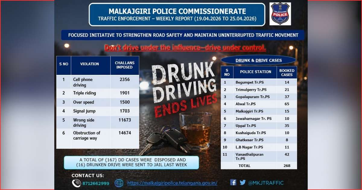 Hyderabad: Malkajgiri Traffic Police booked 268 motorists during a week-long drunk driving enforcement drive conducted between April 19 and April 25, 2026.