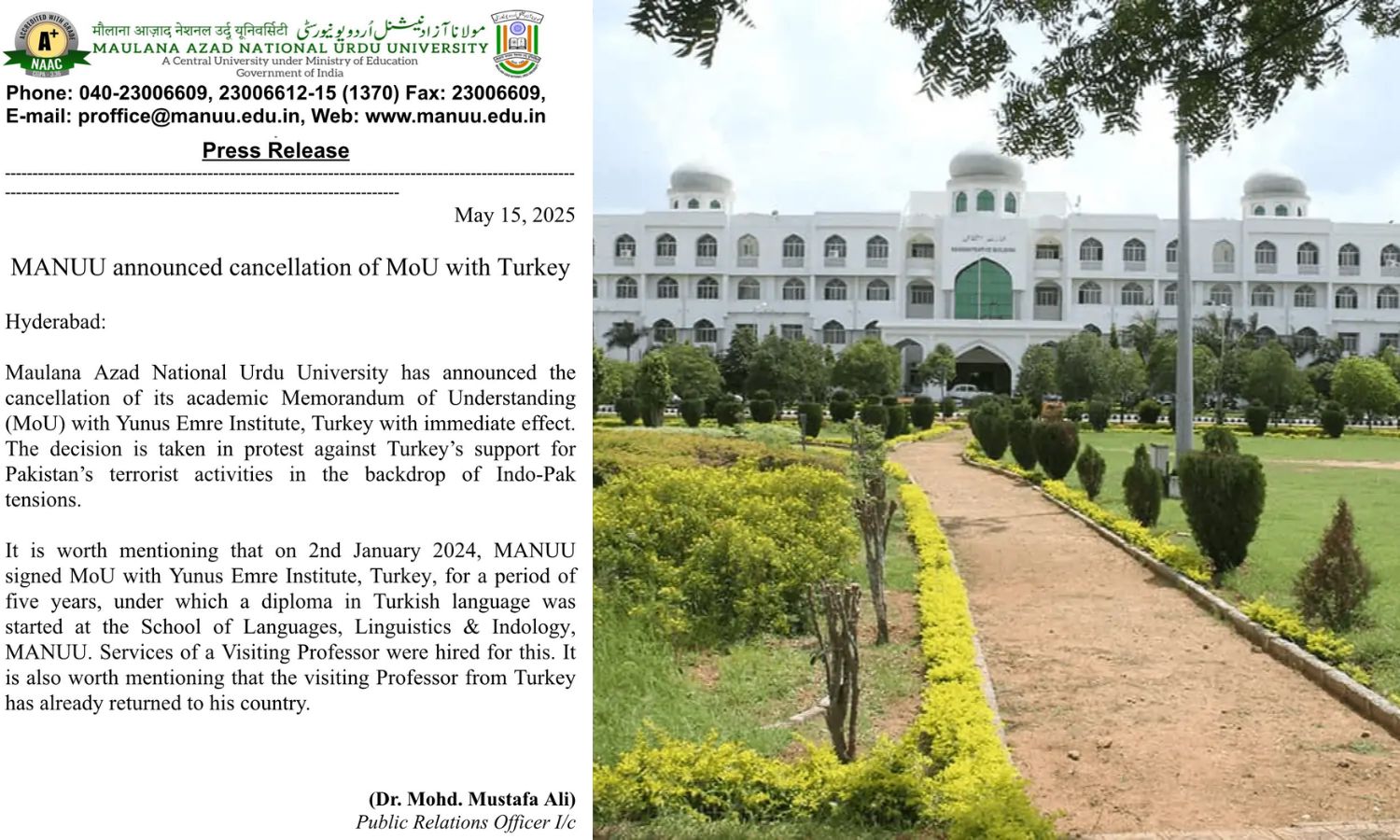 Hyderabad: Maulana Azad National Urdu University has pulled the plug on its five-year academic partnership with Turkey’s Yunus Emre Institute, citing Ankara’s support for Pakistan’s terror-linked activities. The cancellation is with immediate effect.