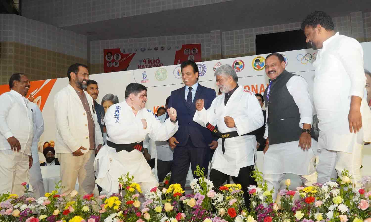 HYDERABAD: The 4th KIO National Karate Championship 2025 commenced at Gachibowli Stadium on Friday, featuring a notable karate demonstration by Transport Minister Ponnam Prabhakar and Legislative Assembly Speaker Gaddam Prasad Kumar. Both dignitaries were awarded black belts by the event organizers and posed for photographs in karate stances, adding a light-hearted moment to the inauguration.