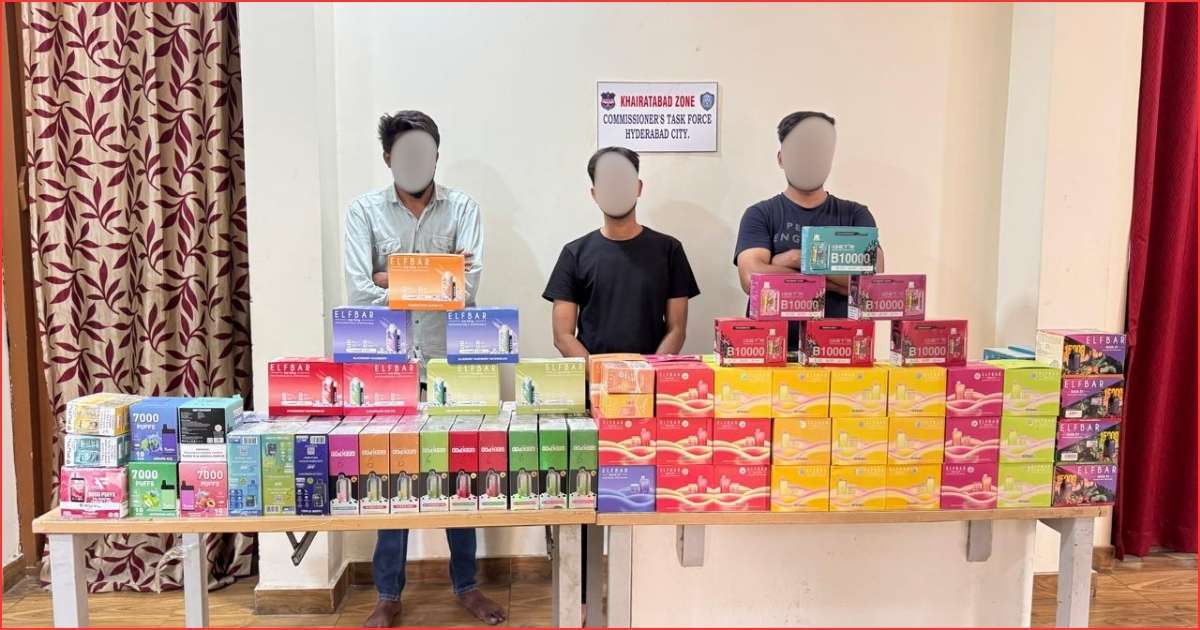 On April 10 evening, the Task Force team and Nampally Police apprehended all three accused. During the operation, officers seized 999 electronic cigarettes, a Burgman two-wheeler, four mobile phones and packing materials.