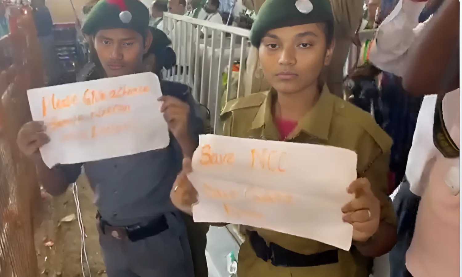 Carrying placards reading “Save NCC,” the students demanded more employment opportunities in the Indian Army and NCC wings. Police quickly intervened, seized the placards, and removed the protesters from the venue.
