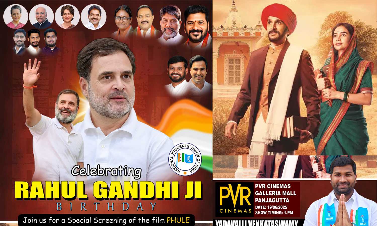 Hyderabad: The National Students’ Union of India (NSUI), Telangana unit, will host a special screening of the film Phule on June 19 to mark the birthday of Congress leader and Leader of the Opposition, Rahul Gandhi. The screening is scheduled at 12:00 PM at PVR Cinemas, Next Galleria Mall, Panjagutta.