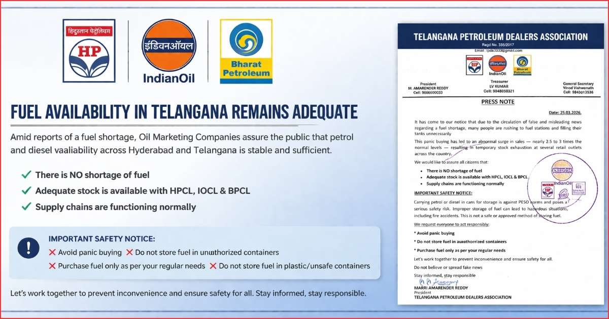 Hyderabad: Oil Marketing Companies assured that fuel availability in Telangana remained adequate and urged the public to avoid panic buying.