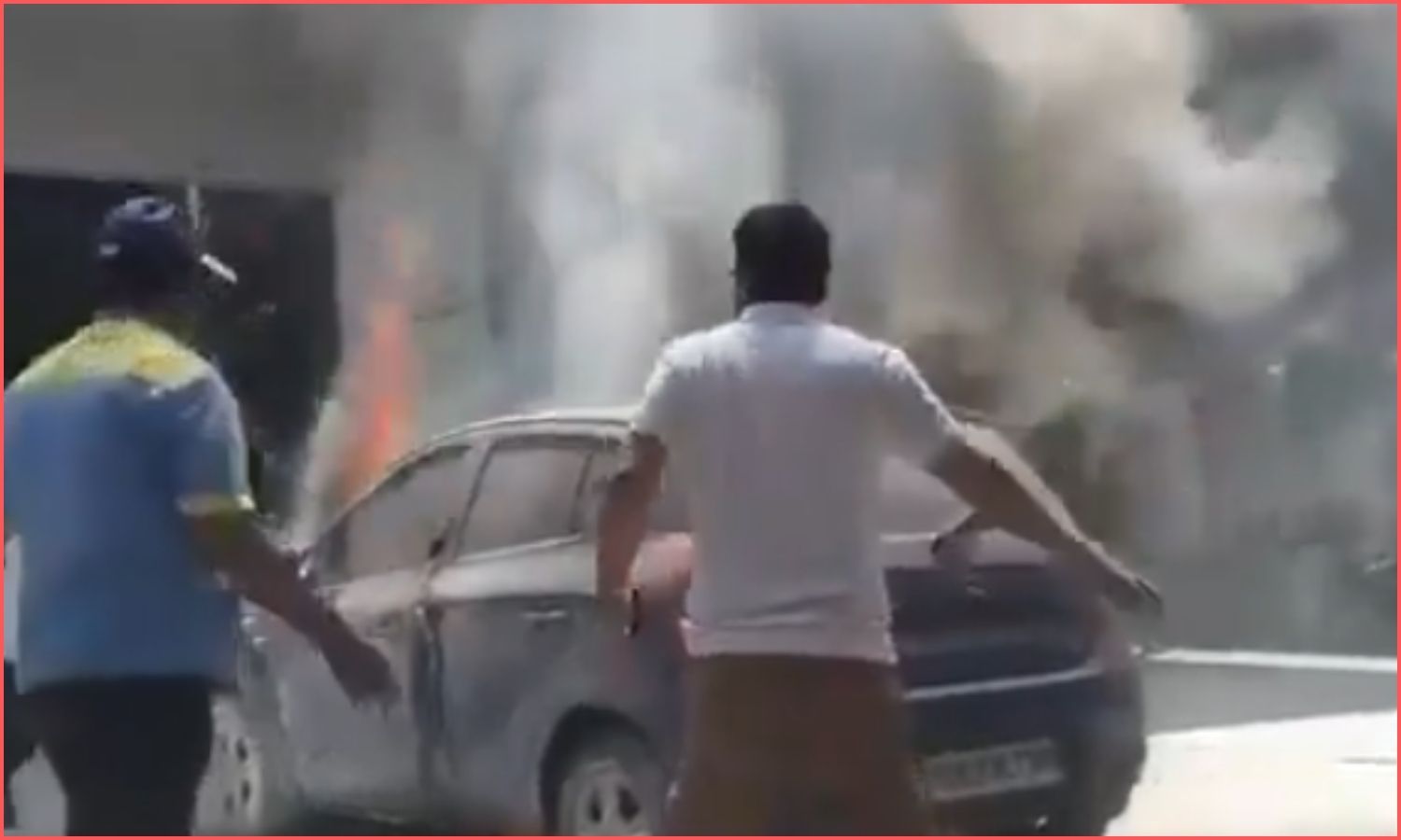 The driver and another occupant spotted smoke and sparks from the front and jumped out immediately. Petrol pump staff grabbed extinguishers, doused the flames, and pushed the burning car onto the road, stopping a major disaster.