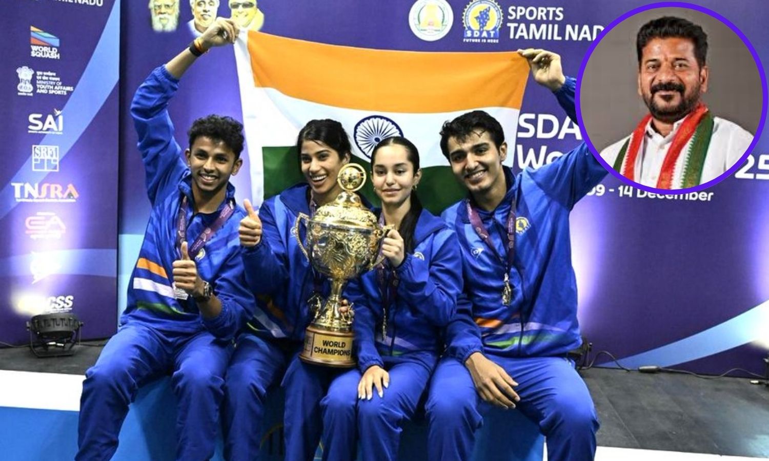 Revanth Reddy extended special congratulations to Joshna Chinappa, Abhay Singh, Anahat Singh, and Velavan Senthil Kumar for their outstanding performance in the tournament.