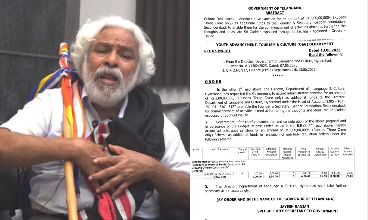 The allocation fulfils a commitment made by Chief Minister Revanth Reddy during last year’s Gaddar Jayanthi celebrations. The State’s Language and Culture department has formally issued the sanction order.