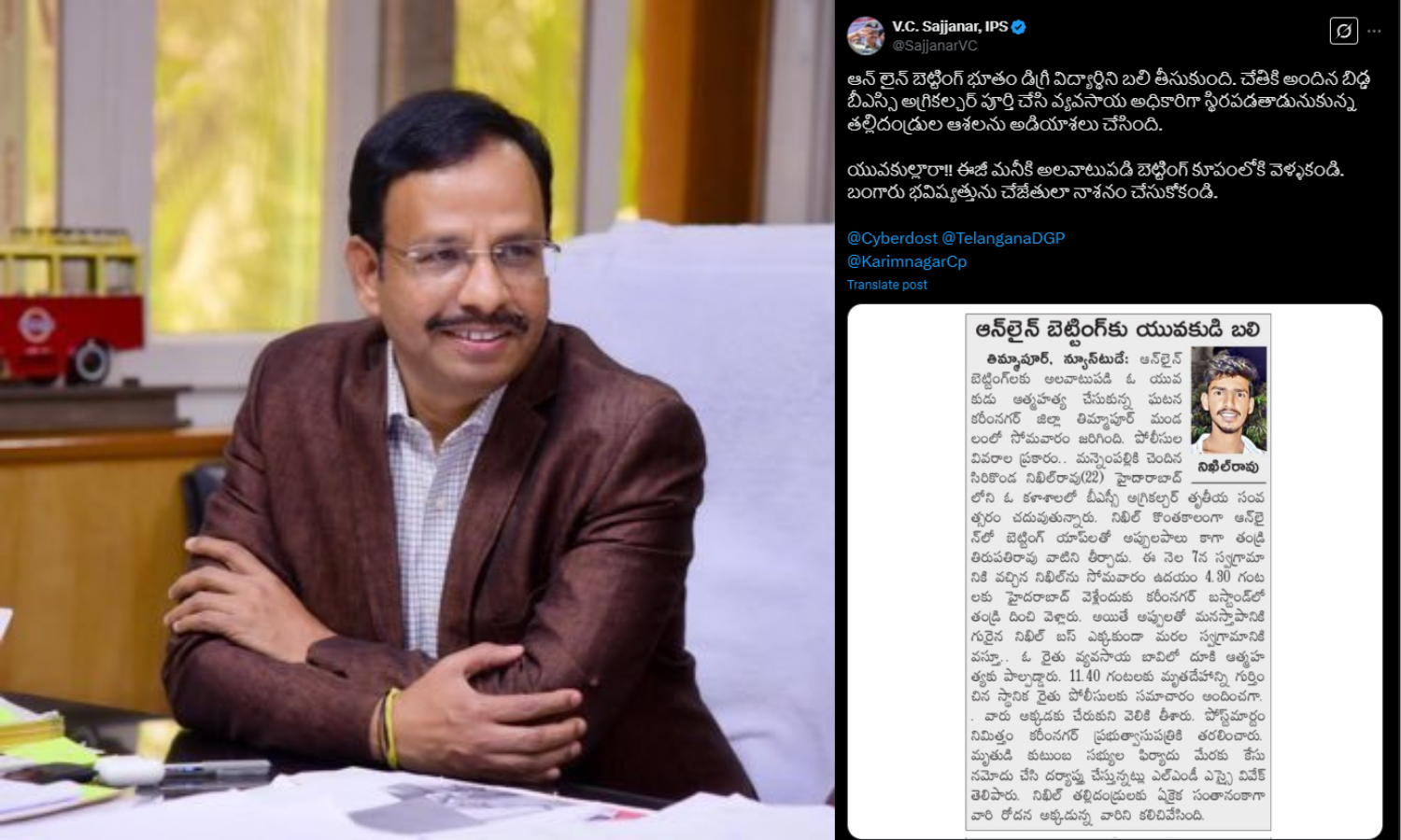 Sajjanar shared a news clipping on his Twitter account detailing the recent suicide of Nikhil Rao, a 22-year-old B.Sc. Agriculture student from Mannempalli village in Karimnagar district. Nikhil had reportedly become addicted to online betting apps, accruing significant debts. Despite his father’s efforts to clear these debts, Nikhil continued to gamble, ultimately leading to his suicide by jumping into an agricultural well near his village. He was the only child of his parents, who are now devastated by the loss.