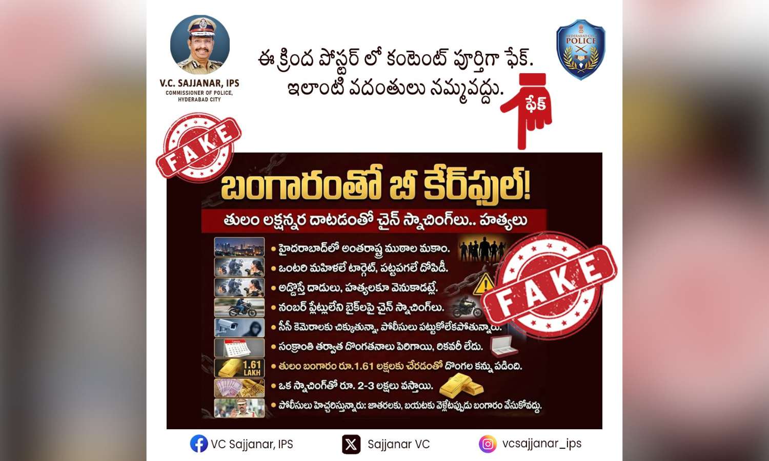 Sajjanar said posts linking higher gold prices to more chain-snatchings and claims about interstate gangs operating in the city had no basis in fact. He asked people not to forward such misleading or panic-driven messages.