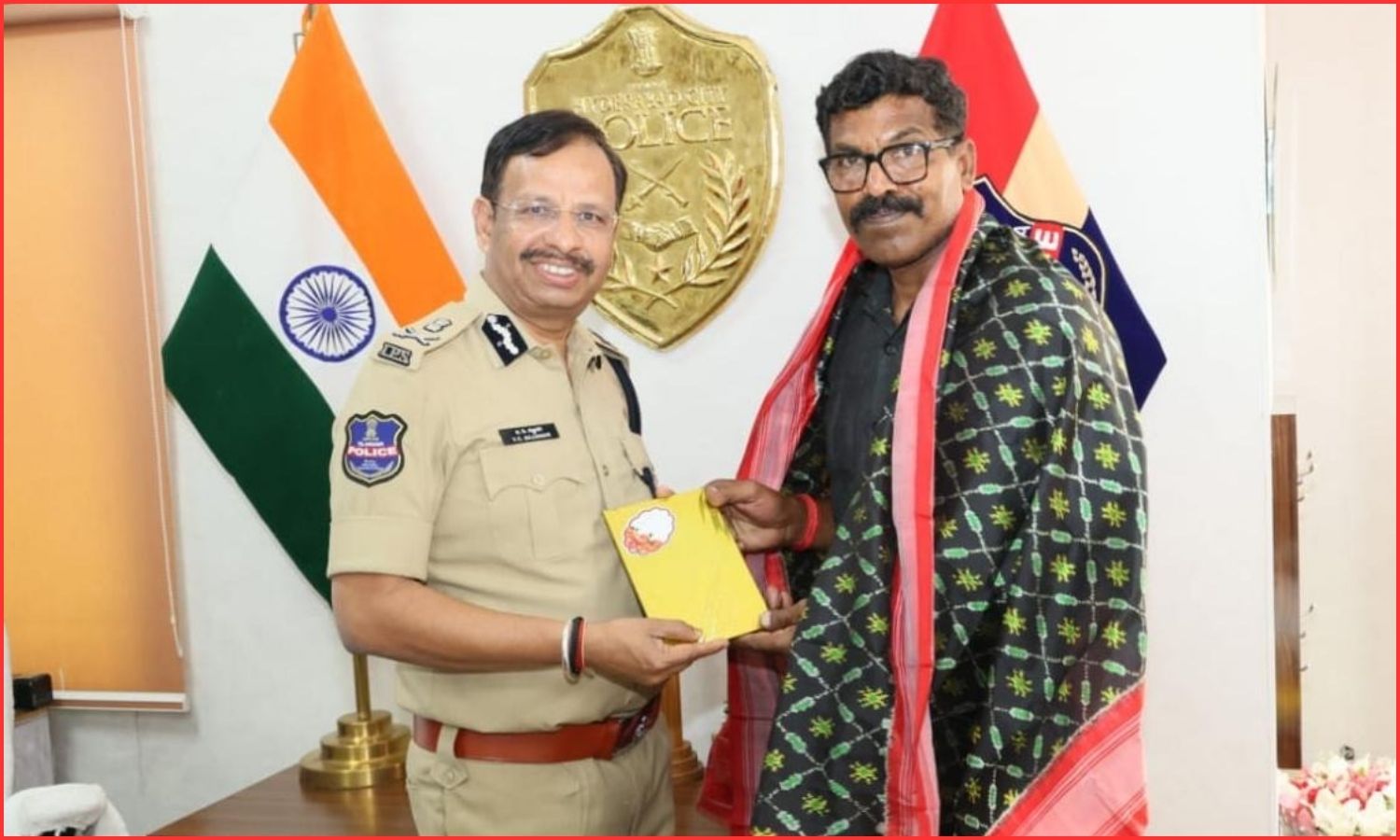 The Commissioner felicitated Chirrla Ramudu at the old Commissionerate office in Basheer Bagh. He presented him with a shawl and a cash reward in recognition of his bravery.