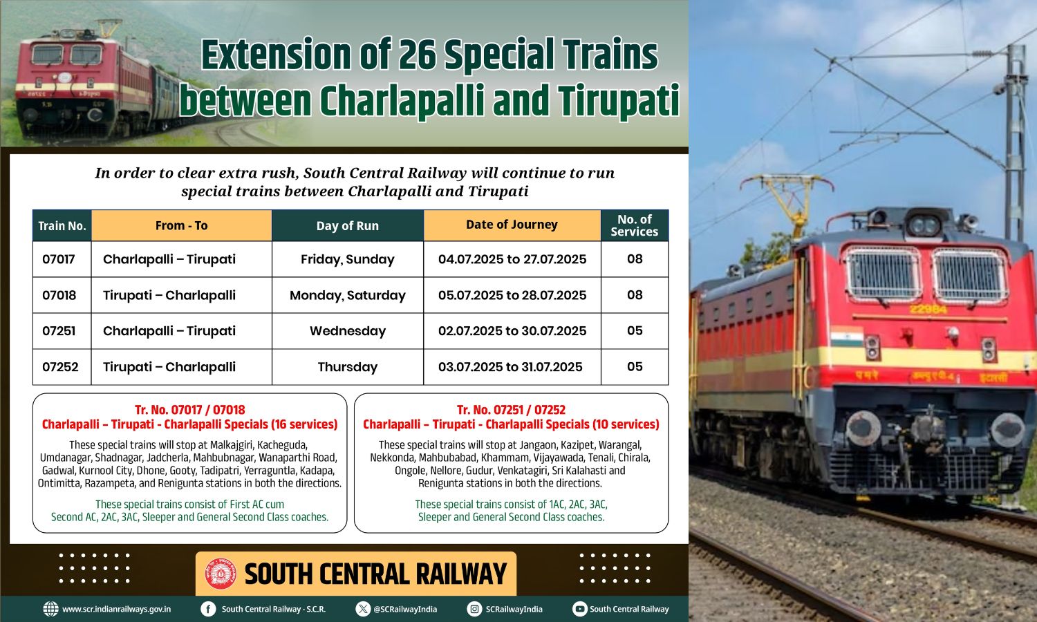 Hyderabad: With passenger demand on the rise, South Central Railway has announced the extension of 26 special trains between Charlapalli and Tirupati through the month of July, aimed at easing congestion during peak travel days.
