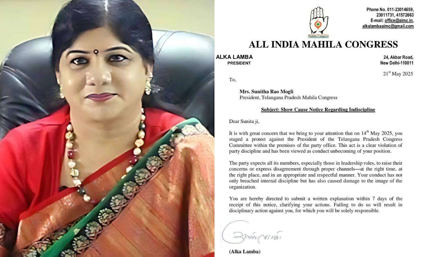 The notice, dated 21 May and signed by Mahila Congress national president Alka Lamba, refers to an incident on 14 May in which Mogli reportedly staged a protest against the Telangana Pradesh Congress Committee (TPCC) president inside the party’s office premises. The letter described Mogli’s actions as a serious breach of party discipline and behaviour unworthy of her position.