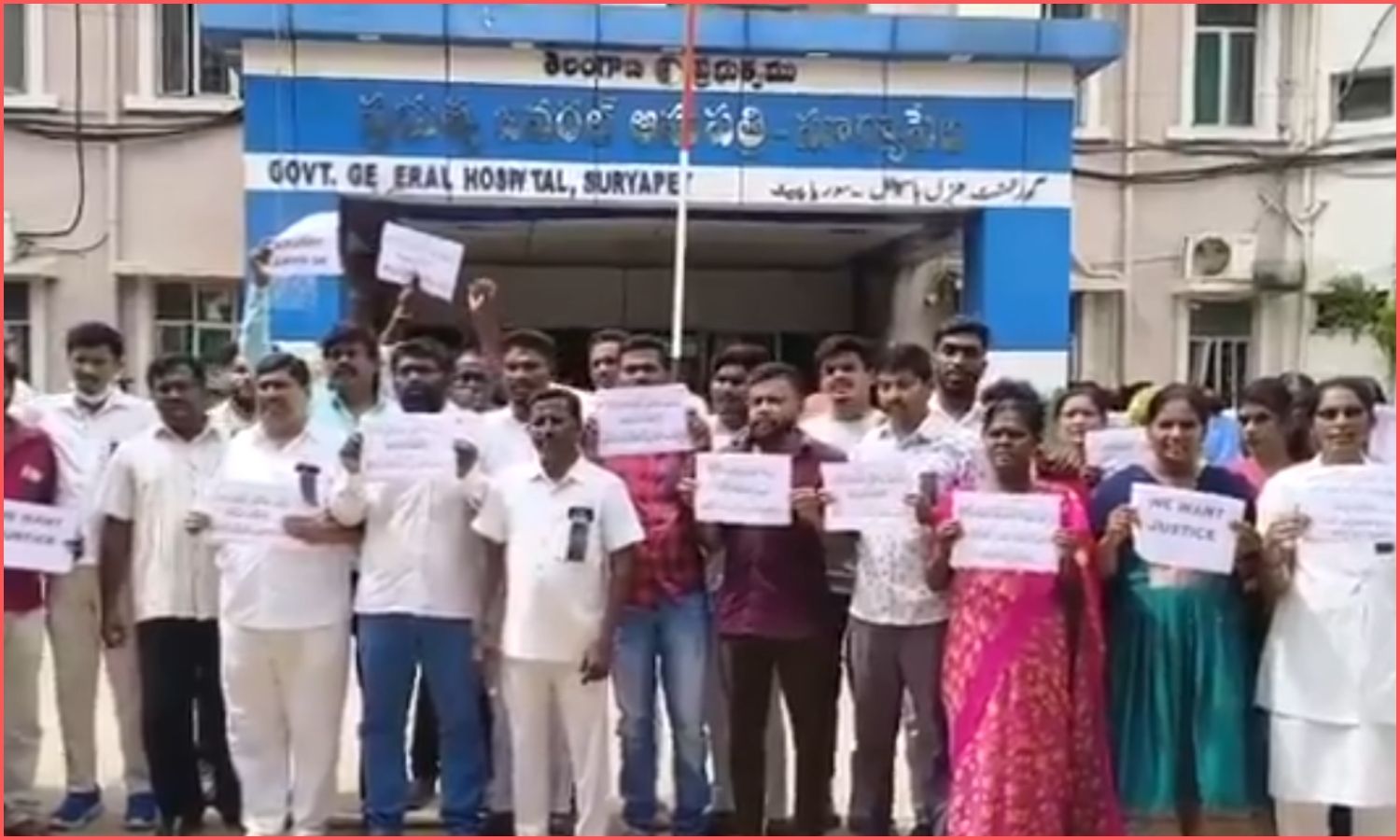 Hyderabad: Outsourcing staff at Suryapet Government General Hospital staged a protest on Tuesday demanding immediate release of their pending salaries. The employees said 126 outsourcing workers, including lab technicians, computer operators, and drivers, had not received wages for the past five months.