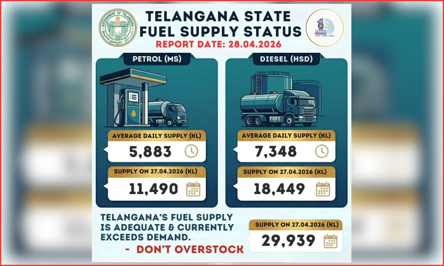 The Civil Supplies Department said Telangana had no fuel shortage and urged citizens to avoid panic buying or believing rumours. Officials said fuel stations would continue to receive adequate supplies for public and agricultural needs.