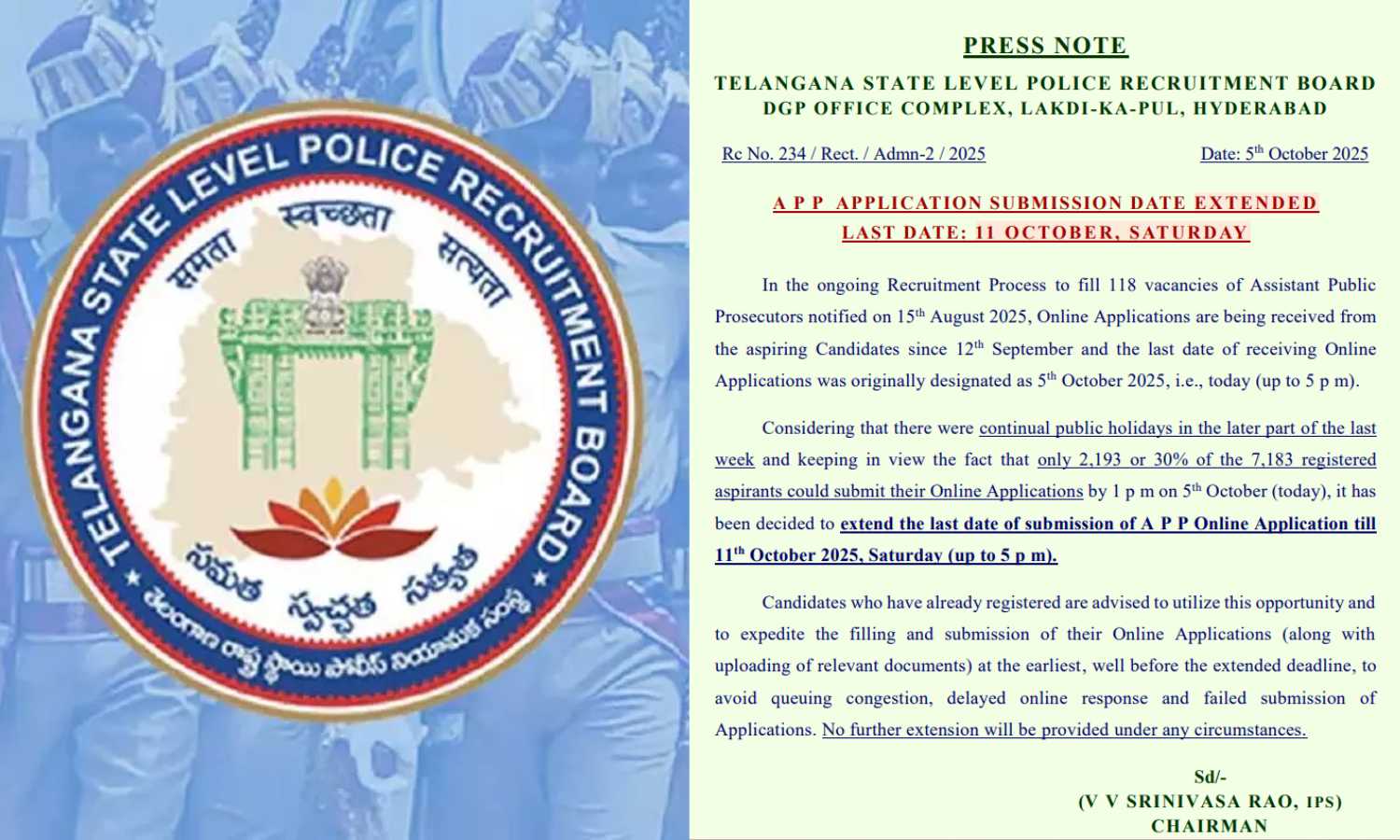 Hyderabad: The Telangana State Police Recruitment Board has extended the application deadline for the post of Assistant Public Prosecutor (APP) from October 5 to October 11. The decision came after candidates requested an extension, citing back-to-back holidays and difficulties in submitting applications on time.